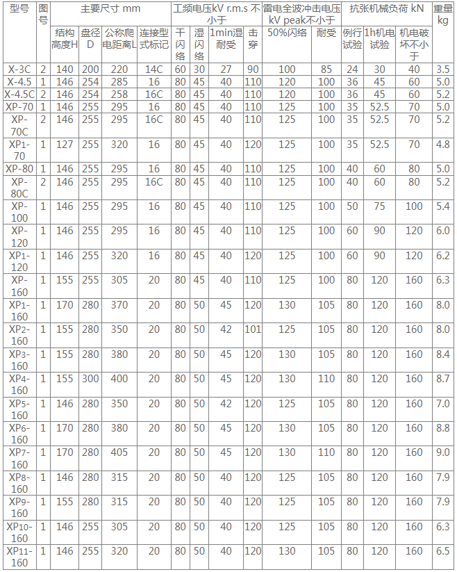 XP—以機(jī)電破壞負(fù)荷表示的普通型懸式瓷絕緣子;X—以一小時(shí)機(jī)電負(fù)荷表示的普通型懸式瓷絕緣子,其右下角數(shù)字為設(shè)計(jì)順序