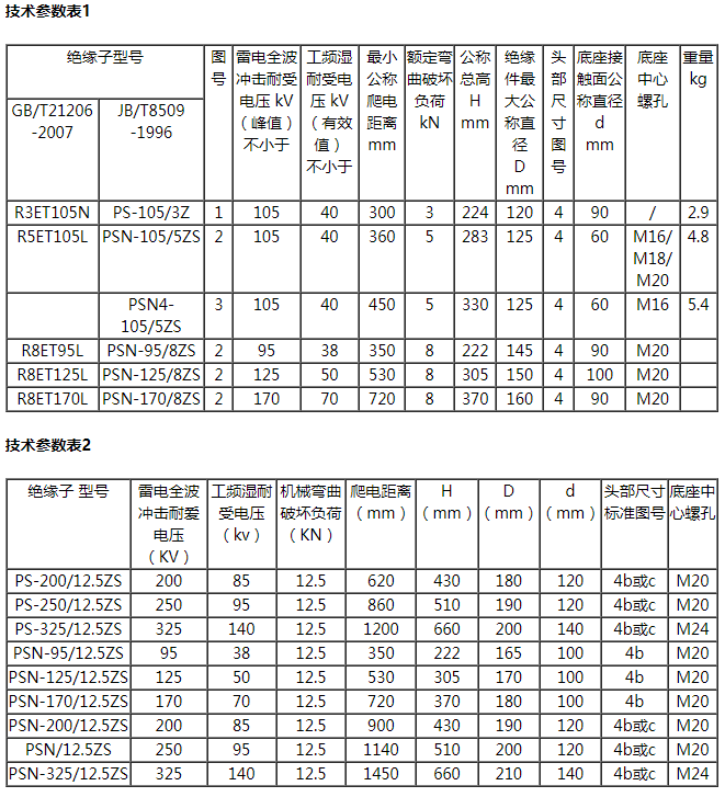 線路柱式瓷絕緣子按額定雷電沖擊耐受電壓值分為95、105、125、150、170、200、250和325kV八個(gè)等級;按額定彎曲破壞負(fù)